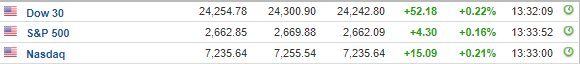 Περί τις 16:30, ο Dow Jones ενισχυόταν κατά 0,2% στις 24.255 μονάδες, ο S&P 500 σημείωνε άνοδο 0,1% στις 2.662 μονάδες και ο Nasdaq κινείτο κατά 0,3% υψηλότερα στις 7.239 μονάδες.