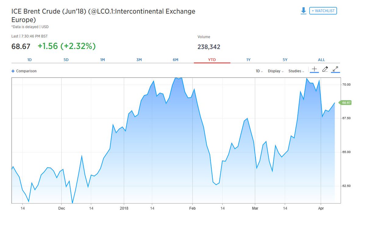 Σε ανάλογη πορεία κινήθηκε το προθεσμιακό συμβόλαιο και για το Brent, με κέρδη 2,4% και διαμόρφωση στα 68,61 δολάρια.