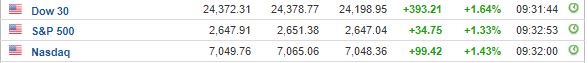 Περί τις 16:30, ο Dow Jones Industrial average ενισχυόταν κατά 1,6% στις 24.372 μονάδες, ο S&P 500 σημείωνε άνοδο 1,3% στις 2.646 μονάδες, ενώ ο Nasdaq κινείτο κατά 1,4% υψηλότερα, στις 7.045 μονάδες.