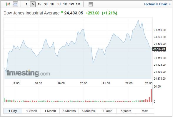 Ο Dow Jones Industrial average ενισχύθηκε κατά 1,21% στις 24.482,74 μονάδες, ο S&P 500 σημείωσε άνοδο 0,83% στις 2.663,99 μονάδες, ενώ ο Nasdaq έκλεισε κατά 1,01% υψηλότερα, στις 7.140,25 μονάδες.