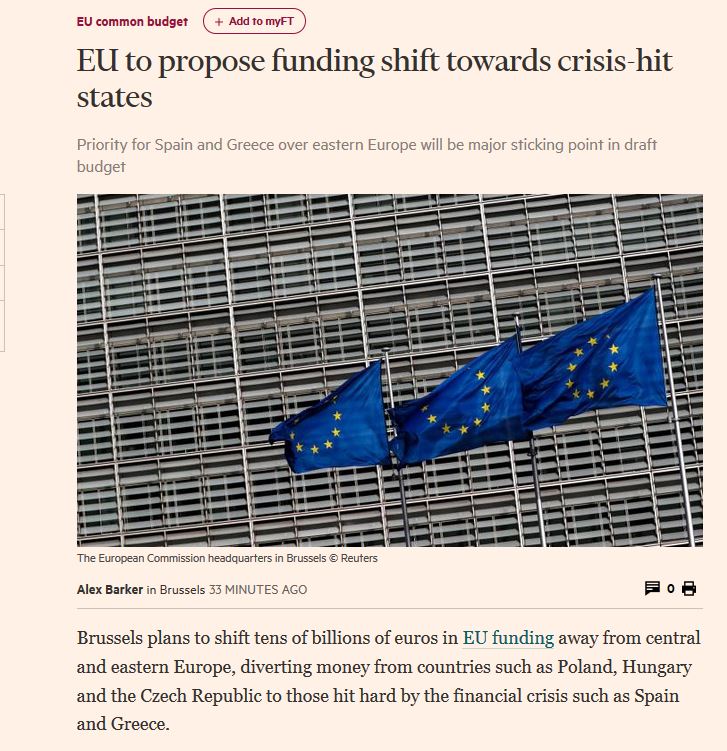 Οι Βρυξέλλες σχεδιάζουν να μεταφέρουν δεκάδες δισεκατομμύρια ευρώ από τη χρηματοδότηση της ΕΕ σε από την Κεντρική και Ανατολική Ευρώπη, διοχετεύοντας τους πόρους από χώρες όπως η Πολωνία, η Ουγγαρία και η Τσεχία σε εκείνους που πλήττονται σκληρά από τη χρηματοπιστωτική κρίση όπως η Ισπανία και η Ελλάδα, αναφέρει η βρετανική εφημερίδα.