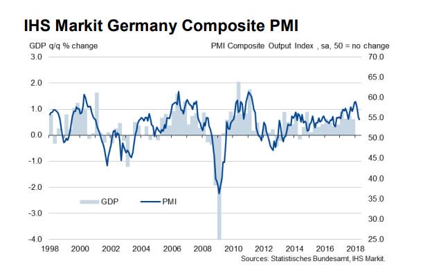 Στα χαημλότερα επίπεδα των τελευταίων 19 μηνών υποχώρησε το επιχειρηματικό κλίμα στη Γερμανία για τον Απρίλιο του 2018, σύμφωνα με τα σημερινά (4/5) στοιχεία της Markit, με τον σχετικό δείκτη να υποχωρεί ακόμα περισσότερο από τα υψηλά επτά ετών στα οποία βρέθηκε στις αρχές του τρέχοντος έτους.
