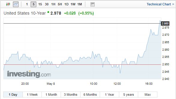 Περί τις 17:00, η απόδοση του 10ετούς κρατικού ομολόγου των ΗΠΑ ενισχυόταν στο 2,98% (+1%).