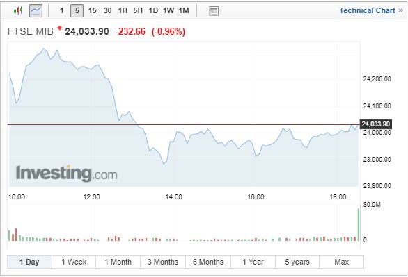 Στο Μιλάνο, ο FTSE MIB δέχτηκε πιέσεις, καταγράφοντας απώλειες 0,96% στις 24.033,90 μονάδες, ενώ όλα δείχνουν πως «κλειδώνει» μια συγκυβέρνηση του Κινήματος των 5 Αστέρων και της Λέγκα του Βορρά.