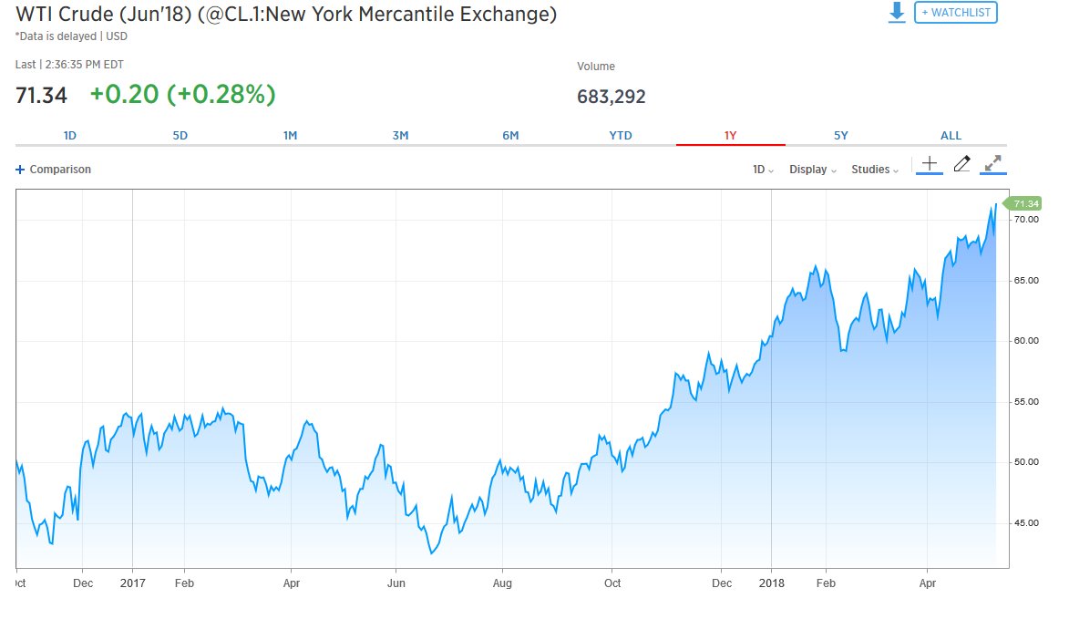 Ανάλογη εικόνα και για το αμερικανικό ελαφρύ αργό (WTI), με το προθεσμιακό συμβόλαιο Ιουνίου 2018, με άνοδο 0,32% στα 71,34 δολάρια το βαρέλι.