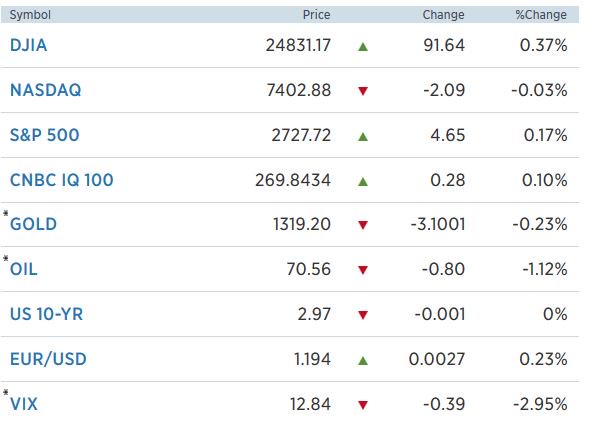 Κέρδη 0,17% για τον S&P 500 στις 2.727 μονάδες, ενώ αντίθετα οριακές απώλειες 0,03% σημείωσε ο Nasdaq στις 7.402 μονάδες.