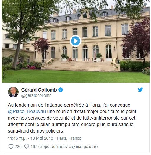 «Μετά από την επίθεση στο Παρίσι, συγκάλεσα υπηρεσιακό συμβούλιο, εξετάζοντας την κατάσταση με τις υπηρεσίες ασφάλειας και καταπολέμησης της τρομοκρατίας» έγραψε χαρακτηριστικά ο γάλλος υπουργός στο Twitter.