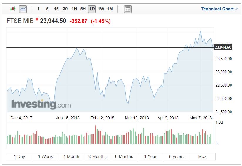 (upd) Ισχυρές πιέσεις δέχεται σήμερα (16/5/2018) το χρηματιστήριο του Μιλάνου, εν μέσω αυξημένης ανησυχίας για την προγραμματική συμφωνία της νέας κυβέρνησης Λέγκας - Πέντε Αστέρων στην Ιταλία.