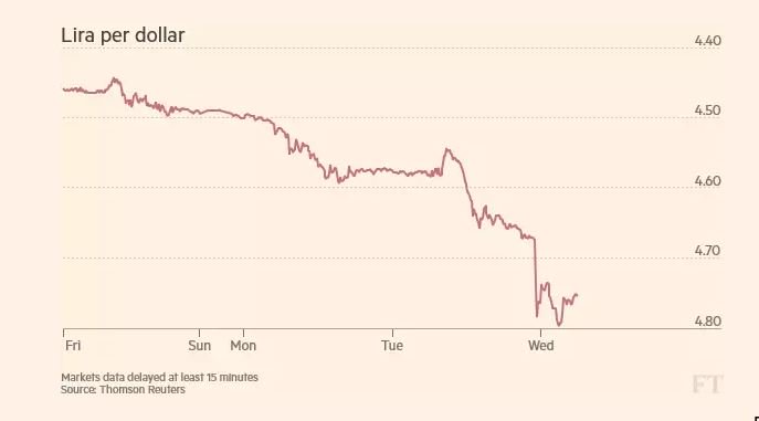 Η κεντρική τράπεζα της Τουρκίας αύξησε το επιτόκιο δανεισμού κατά 75 μονάδες βάσης τον Απρίλιο, αλλά η λίρα εξακολούθησε να υποχωρεί, καθώς ο τούρκος πρόεδρο, Recep Tayyip Erdogan, δεσμεύτηκε προεκλογικά ότι τα επιτόκια θα μειωθούν περαιτέρω, αλλά και ότι θα αναλάβει περισσότερες ευθύνες αναφορικά με τη νομισματική πολιτική αν κερδίσει τις εκλογές του Ιουνίου.