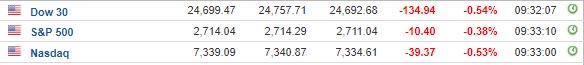 Περί τις 16:30, ο Dow Jones Industrial average υποχωρούσε κατά 0,5% στις 24.669 μονάδες, ο S&P 500 σημείωνε πτώση 0,4% στις 2.712 μονάδες, ενώ ο Nasdaq κινείτο κατά 0,5% χαμηλότερα, στις 7.341 μονάδες.