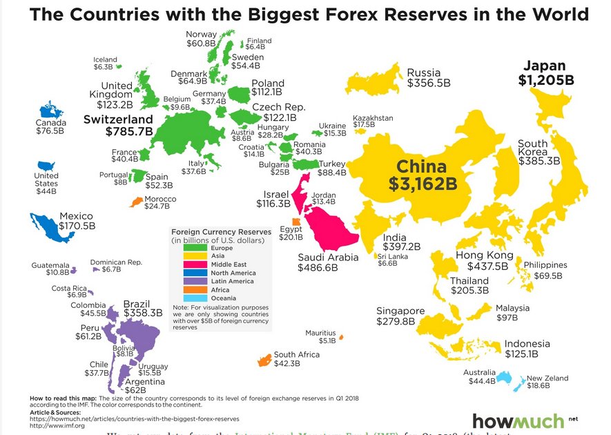 Όπως αποδεικνύεται και στο διάγραμμα η «διάχυση» των συναλλαγματικών αποθεμάτων είναι ιδιαίτερα άνιση ανά την υφήλιο, με την κορυφαία Κίνα να διαθέτει τριπλάσια συναλλαγματικά αποθέματα από τη δεύτερη στην κατάταξη Ιαπωνία.