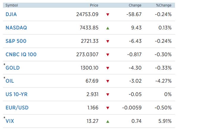 Στη συνεδρίαση της Παρασκευής 25/5 οι τρεις βασικοί δείκτες κινήθηκαν πτωτικά, με τον Dow Jones να υποχωρεί 0,2% στις 24.752 μονάδες.