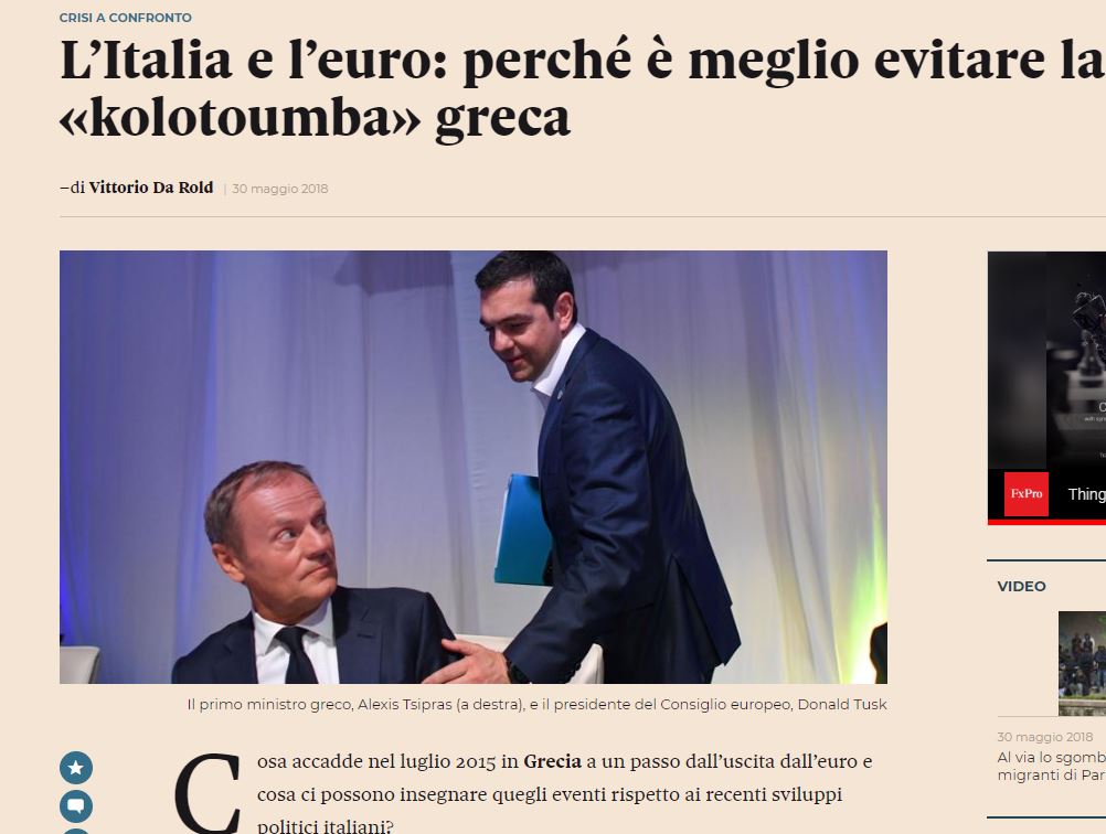 Συμβουλεύει μάλιστα τους Ιταλούς πολιτικούς να αποφύγουν... μια ελληνική κωλοτούμπα, όρος ο οποίος έχει καταστεί πλέον διεθνής, μετά το καλοκαίρι του 2015 και τον συμβιβασμό του πρωθυπουργού Αλέξη Τσίπρα μετά το δημοψήφισμα του Ιουλίου.