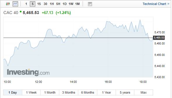 Ο FTSE 100 στο Λονδίνο ενισχύθηκε κατά 0,31% στις 7.701,77 μονάδες, ενώ στις 5.465,53 μονάδες έκλεισε ο CAC 40 στο Παρίσι, με άνοδο 1,24%.