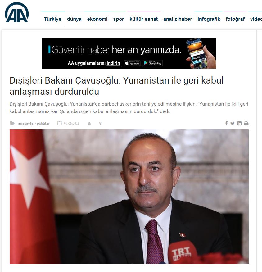 Η ανακοίνωση έγινε από τον Τούρκο υπουργό Εξωτερικών, Mevlut Cavusoglu, ο οποίος αναφερόμενος στην απελευθέρωση των 8 τόνισε ότι αυτό που κάνει η Ελλάδα είναι απαράδεκτο.