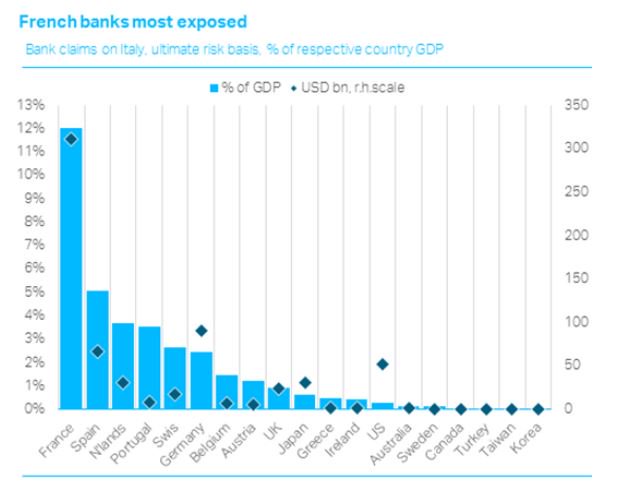 Σύμφωνα με έκθεση της TS Lombard, η Γαλλία κατέχει το υψηλότερο ποσοστό ιταλικού χρέους - 311 δισ. δολάρια, το οποίο αντιπροσωπεύει το 12% του γαλλικού ΑΕΠ, καθιστώντας τηνμ την το πιο ευάλωτο σε μι πιθανή κρίση στην Ιταλία.