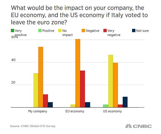 Σύμφωνα με την τελευταία έρευνα του Global CFO Council (συμμετέχουν διευθυντικά στελέχη από μερικές από τις μεγαλύτερες δημόσιες και ιδιωτικές εταιρείες παγκοσμίως) του CNBC, το 77% των ερωτηθέντων εκφράζει την ανησυχία του για το ενδεχόμενο η Ιταλία να γυρίσει την πλάτη της στο ευρώ.