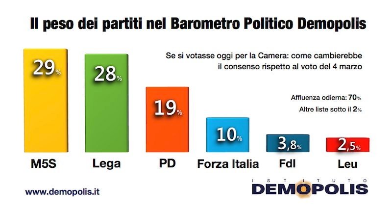 Στις τελευταίες δημοσκοπήσεις το Κίνημα 5 Αστέρων λαμβάνουν 29%, η Lega North 28% και οι σοσιαλιστές 19%.