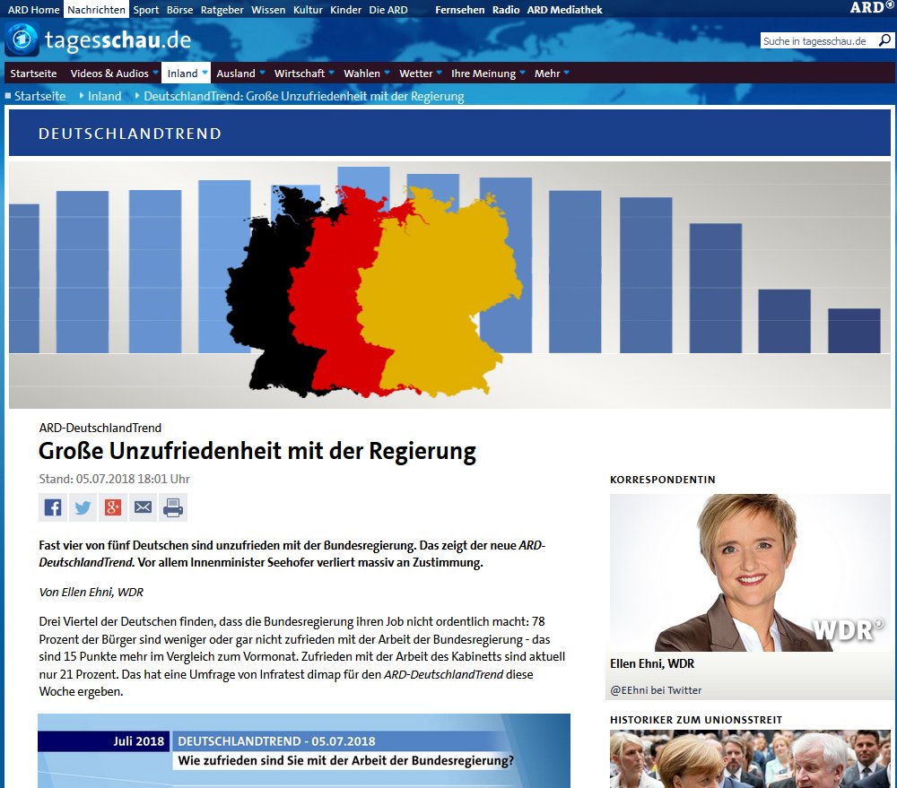 Αναφορικά με τη δημοτικότητα των βασικών «παικτών» της πολιτικής ζωής της χώρας, το ποσοστό της Angela Merkel υποχώρησε στο 48%, μειωμένο κατά δύο ποσοστιαίες μονάδες, ενώ αυτό του Horst Seehofer (υπουργός Εσωτερικών και επικεφαλής του CSU) «προσγειώθηκε» στο 27%, με απώλειες 27 ποσοστιαίων μονάδων.