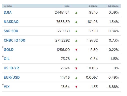 O δείκτης Dow Jones διαμορφώθηκε στις 24.451,84 μονάδες με άνοδο +0,39%, κέρδη +1,34% για το δείκτη Nasadaq στις 7.688,39 μονάδες, κέρδη +0,84% ο δείκτης S&P 500 στις 2.7591,71 μονάδες.