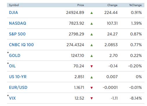 Ο Dow Jones ενισχύθηκε κατά 0,9% στις 24.925 μονάδες και ο S&P 500 σημείωσε άνοδο 0,87% στις 2.798 μονάδες.