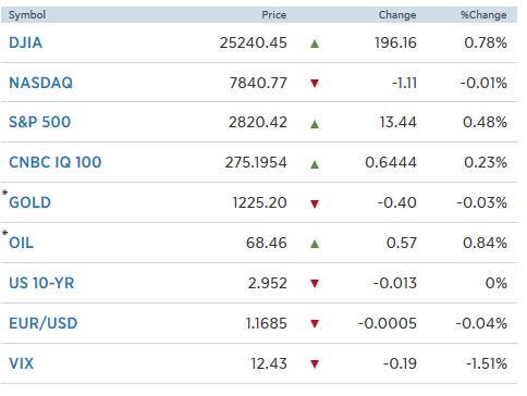 Ο δείκτης Dow Jones ενισχύθηκε κατά 0,78% στις 25.240,45 μονάδες, ο S&P 500 σημείωσε κέρδη 0,48% στις 2.820,35 μονάδες, ενώ ο Nasdaq έκλεισε τελικά με οριακές απώλειες κατά 0,01% στις 7.840,77 μονάδες, λόγω κατοχύρωση βραχυχρόνιων κερδών από τους επενδυτές.
