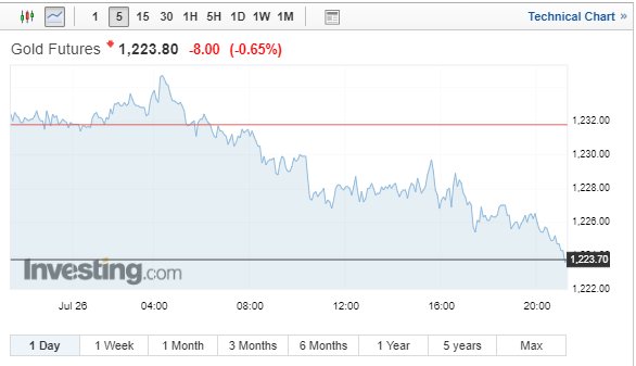 Με απώλειες έκλεισε σήμερα (26/7/2018) ο χρυσός, υποχωρώντας κοντά στα χαμηλά του για το 2018, καθώς το δολάριο ενισχύθηκε έναντι του ευρώ.