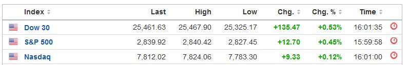 Κέρδη 0,54% για τον Dow Jones στις 25.462 μονάδες, με τον S&P 500 να ενισχύεται 0,46% στις 2.840 μονάδες και τον Nasdaq να κινείται 0,12% υψηλότερα στις 7.812 μονάδες.