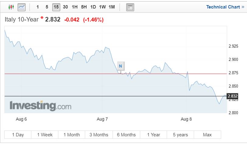 Στον απόηχο των δηλώσεων Conte, η απόδοση του ιταλικού 10ετούς ομολόγου υποχωρεί στο 2,83% για να επιδεινωθεί αργότερα στο 2,92%.