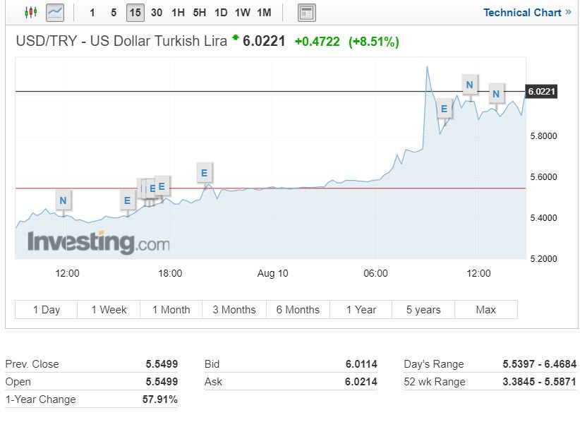 Η πτώση της τουρκικής λίρας έναντι του δολαρίου συνεχίζεται, καθώς έσπασε και το φράγμα των 6 λιρών ανά δολάριο, παρά τις προσπάθειες της κυβέρνησης και της κεντρικής τράπεζας της Τουρκίας, να καθησυχάσουν τους επενδυτές και να τους πείσουν ότι η τουρκική οικονομία θα συνεχίσει να είναι… ζωντανή.