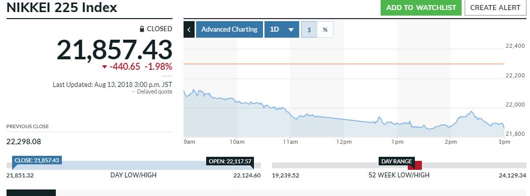 Στην Ιαπωνία, ο δείκτης Nikkei 225 έκλεισε με πτώση 1,98% στις 21.857,43 μονάδες.