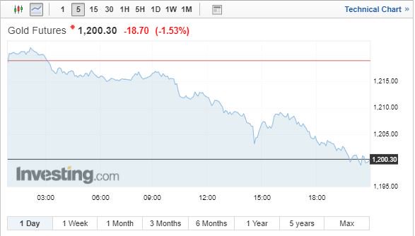 Έτσι, η τιμή του συμβολαίου του χρυσού παραδόσεως Δεκεμβρίου έκλεισε σήμερα με απώλειες 20,10 δολ. ή 1,6% -καταγράφοντας τη μεγαλύτερη πτώση από τις 15 Ιουνίου 2018- στα 1.198,90 δολ. ανά ουγγιά -το χαμηλότερο επίπεδο από τις 30 Ιανουαρίου, σύμφωνα με δεδομένα της FactSet.