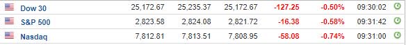 Περί τις 16:30, ο Dow Jones υποχωρεί κατά 0,5% στις 25.163 μονάδες, ο S&P 500 σημειώνει πτώση 0,5% στις 2.825 μονάδες, ενώ ο Nasdaq κινείται κατά 0,5% χαμηλότερα, στις 7.833 μονάδες.