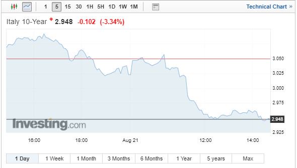 Έτσι, περί τις 14:45, η απόδοση του 10ετούς ομολόγου της Ιταλίας σημειώνει πτώση 10,2 μονάδων βάσης και διαμορφώνεται στο 2,95% -η πρώτη φορά που υποχωρεί κάτω του 3% από τις 10 Αυγούστου 2018.