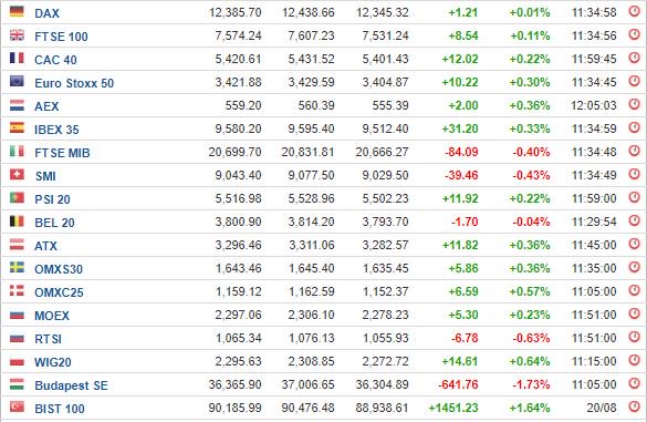 Ο DAX στη Φρανκφούρτη ενισχύθηκε κατά 0,01% στις 12.385,70 μονάδες, ο FTSE 100 στο Λονδίνο σημείωσε άνοδο 0,11% στις 7.574,24 μονάδες, ενώ ο CAC 40 στο Παρίσι έκλεισε κατά 0,22% υψηλότερα στις 5.420,61 μονάδες.
