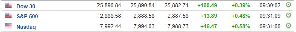 Περί τις 16:30, ο Dow Jones ενισχύεται κατά 0,6% στις 25.947 μονάδες, ο S&P 500 σημειώνει άνοδο 0,5% στις 2.890 μονάδες, ενώ ο Nasdaq κινείται κατά 0,6% υψηλότερα, στις 7.994 μονάδες.
