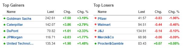 Οι μετοχές των Caterpillar και Boeing ενισχύθηκαν κατά 2,8% και 1,2% αντίστοιχα, καθώς οι δύο εταιρείες θεωρούνται ιδιαίτερα «ευαίσθητες» σε θέματα εμπορίου, λόγω της μεγάλης τους έκθεσης στο εξωτερικό.