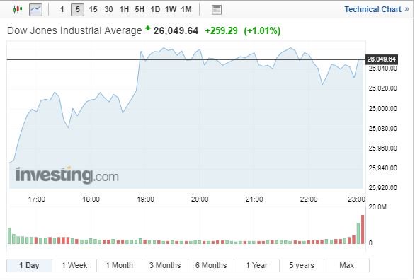 Ο Dow Jones ενισχύθηκε κατά 1,01% κι έκλεισε στις 26.049,64 μονάδες, ο S&P 500 σημείωσε άνοδο 0,77% κι έκλεισε στις 2.896,74 μονάδες, ενώ ο Nasdaq έκλεισε κατά 0,91% υψηλότερα, στις 8.017,90 μονάδες.