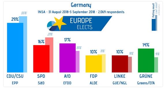 Σύμφωνα με δημοσκόπηση του ινστιτούτου INSA για λογαριασμό της γερμανικής εφημερίδας Bild, στην πρώτη θέση βρίσκονται οι Χριστιανοδημοκράτες/Χριστιανοκοινωνιστές (CDU/CSU) της Merkel με 29% και ακολουθεί με 17% το AfD.