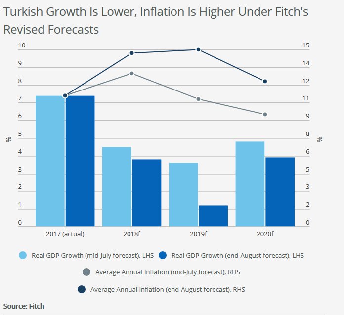 Σύμφωνα με τη Fitch, το ΑΕΠ της Τουρκίας θα αυξηθεί κατά 3,8% το 2018 και 1,2% το 2019, αναθεωρώντας κατά 0,7% και 2,4% χαμηλότερα τις υποθέσεις που διατύπωσε στις 13 Ιουλίου 2018.