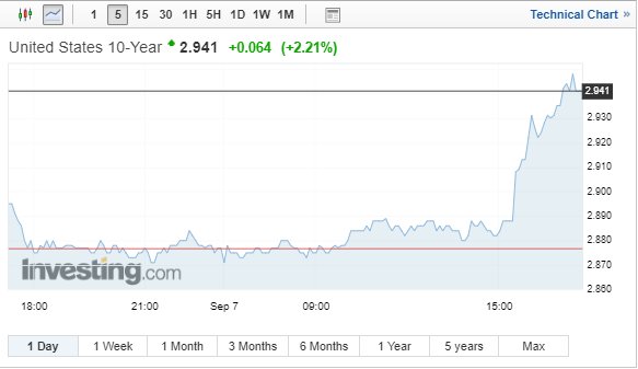 Ανοδικά κινούνται σήμερα (7/9/2018) οι αποδόσεις των κρατικών ομολόγων των ΗΠΑ, στον απόηχο έκθεσης για την απασχόληση στις ΗΠΑ, που έδειξε μια μεγάλη αύξηση των μισθών, εντείνοντας τις προσδοκίες για μια «επιθετικότερη» σύσφιξη της νομισματικής πολιτικής της Ομοσπονδιακής Τράπεζας των ΗΠΑ (Federal Reserve, Fed).