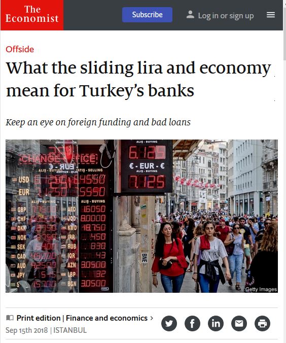 Τον αντίκτυπο που έχει στις τουρκικές τράπεζες η σημαντική υποχώρηση της λίρας και υποχώρηση της ανάπτυξης σχολιάζει ο Economist.