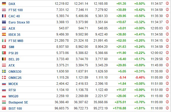 Ο DAX στη Φρανκφούρτη ενισχύθηκε κατά 0,50% κι έκλεισε στις 12.219,02 μονάδες, ο FTSE 100 στο Λονδίνο σημείωσε άνοδο 0,42% στις 7.331,12 μονάδες, ενώ ο CAC 40 στο Παρίσι κατέγραψε κέρδη 0,56% κι έκλεισε στις 5.393,74 μονάδες.