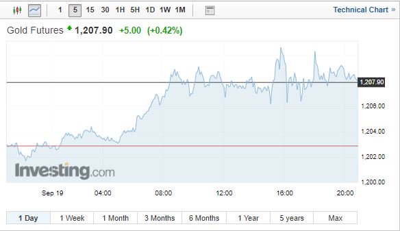 Έτσι, η τιμή του συμβολαίου του χρυσού παραδόσεως Δεκεμβρίου έκλεισε σήμερα με κέρδη 5,40 δολ. ή 0,5% στο υψηλό μιας εβδομάδας των 1.208,30 δολ. ανά ουγγιά.