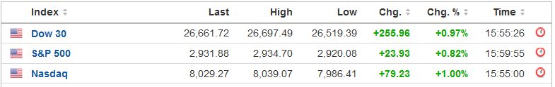 Άνοδο της τάξης του 0,97% σημείωσε ο Dow Jones, ο οποίος διαμορφώθηκε στις 26.661 μονάδες, με τον S&P 500 να κινείται 0,8% υψηλότερα στις 2.931 μονάδες και τον Nasdaq να εμφανίζει κέρδη 1% στις 8.029 μονάδες.