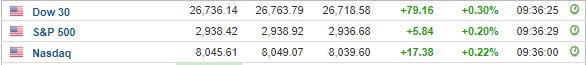 Περί τις 16:30, ο Dow Jones ενισχύεται κατά 0,3% στις 26.739 μονάδες, ο S&P 500 σημειώνει άνοδο 0,2% στις 2.938 μονάδες, ενώ ο Nasdaq κινείται κατά 0,2% υψηλότερα στις 8.046 μονάδες.