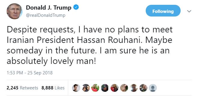 Το ενδεχόμενο να συναντηθεί -τουλάχιστον όχι άμεσα- με τον Ιρανό ομόλογο του απέρριψε ο πρόεδρος των ΗΠΑ, Donald Trump, με σχόλιο του στο twitter.