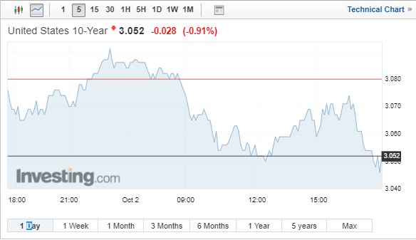 Ελαφριά υποχώρηση καταγράφουν σήμερα (2/10/2018) οι αποδόσεις των κρατικών ομολόγων των ΗΠΑ, καθώς η αναταραχή στην Ιταλία και οι εμπορικές ανησυχίες στρέφουν τους επενδυτές στα πιο ασφαλή καταφύγια.