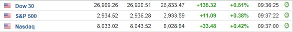 Περί τις 16:30, ο Dow Jones ενισχύεται κατά 0,5% στις 26.901 μονάδες, ο S&P 500 σημειώνει άνοδο 0,4% στις 2.936 μονάδες, ενώ ο Nasdaq κινείται κατά 0,5% υψηλότερα στις 8.043 μονάδες.