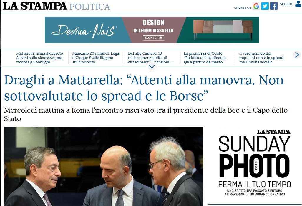 Σύμφωνα με δημοσίευμα της ιταλικής εφημερίδας La Stampa, Draghi και Mattarella συναντήθηκαν το πρωί της Τετάρτης 4/10 με κύριο αντικείμενο τον προϋπολογισμό του 2019 και ενώ μαίνεται η αντιπαράθεση μεταξύ Βρυξελλών και Ρώμης για το ύψος του ελλείμματος.